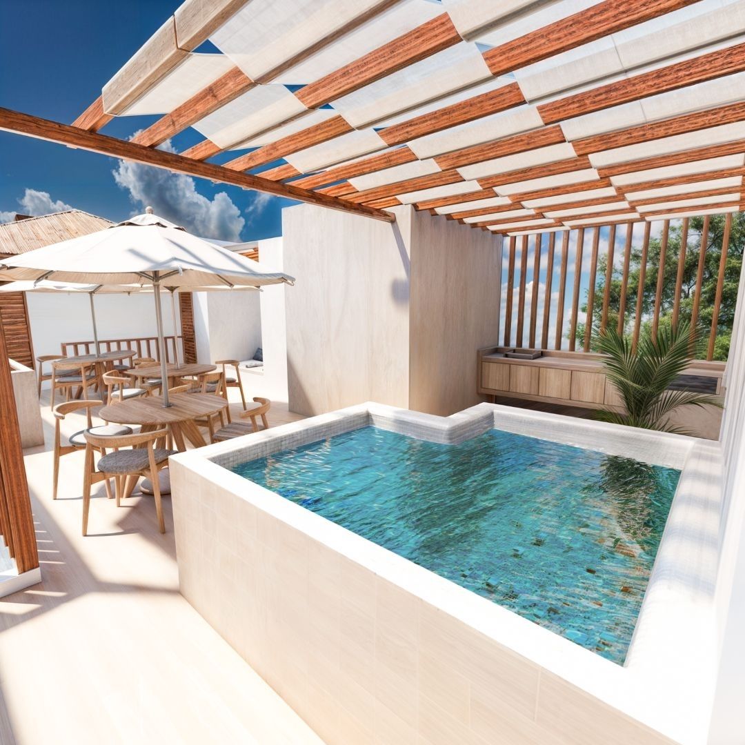Relájate en la alberca, disfruta del jacuzzi y descansa en la sala de estar al aire libre. Con asadores, camastros y vistas panorámicas, este espacio está diseñado solo para ti.